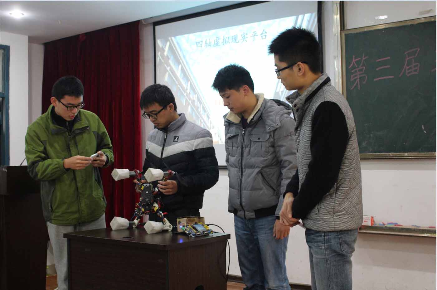 2014年12月21日,第三届“三元达杯”大学生创新竞赛在福州大学物理信息与工程学院南楼隆重举行。从近百支参赛队伍中脱颖而出并入围决赛的14支参赛队伍,携带他们的实物作品接受来自厦大、福大的老师以及海西中心、三元达公司的工程师等多位评委嘉宾的评审。参赛队伍做好充分的准备,通过幻灯片讲解,视频展示,实物演示等多种方式多角度地呈现出参赛作品的创新性与实用性。最终,具有声控功能并且结合虚拟现实的四轴飞行器(福州大学“四人行队”)夺取桂冠,拥有令人惊异演示效果的激光键盘(厦门大学“WFY小队”)同样获得评委老师们的一致好评,最终获得二等奖。其他,拥有独特趣味和创意的儿童音乐手套(嘉庚学院“TKK-Music队”)等作品获得最佳创意的奖项。
