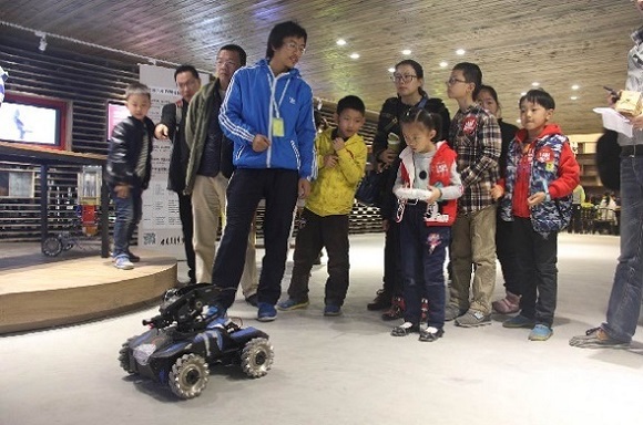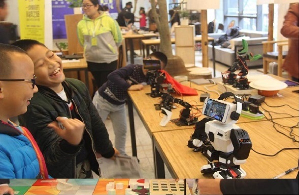 “机器人工作坊”中,孩子正在和手机机器人互动聊天。“手机机器人”是厦大-火炬极客空间创客团队孵化的公司,它使用手机作为机器人的大脑,通过蓝牙控制机架的运动。在2015中美青年创客大赛中,手机机器人项目获得了全国第六名。