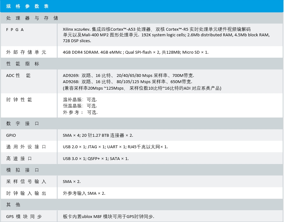 R-ZU-0A-10-S1F4-TG-X1 信号采集板卡集成了Xilinx 16nm 工艺的 Zynq UltraScale+ MPSoC 以及ADI AD926x 序列模数转换芯片,主要面向实时高速信号处理和存储的使用场景。 其中Xilinx FPGA 芯片拥有丰富的逻辑运算单元,可以满足各种复杂的数字信号处理需求;ADI 模数转换芯片可实现高达125Msps 的采样速率,同时pin-to-pin兼容不同指标的ADC转换芯片,如AD9650、AD9251、AD9684等。