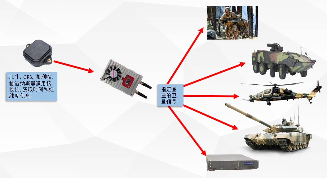 GNSS 转码器接收来自标准接收机的时空信息, 通过算法加以提取,过滤生成纯净的指定卫星体制的射频信号, 用于装备的定位和授时,